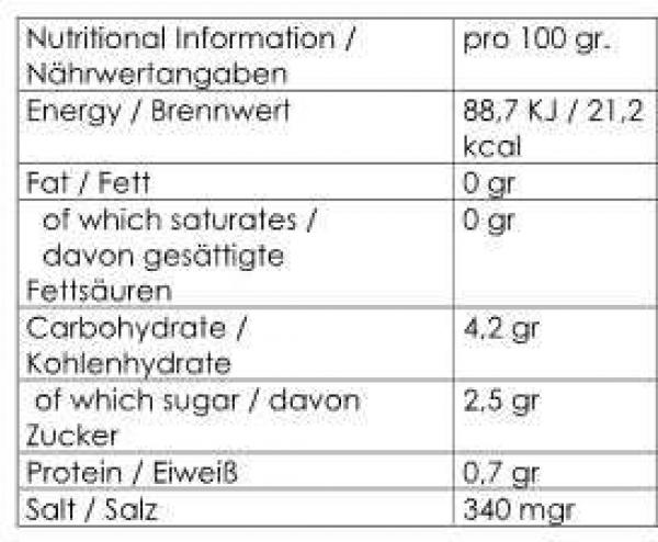 Zutaten: Tomaten, Wasser, gehackte grüne Chilis, weniger als 2% von Salz, Stabilisator Calciumchlorid E509, natürliche Aromen, Konservierungsmittel Zitronensäure E330, Koriander